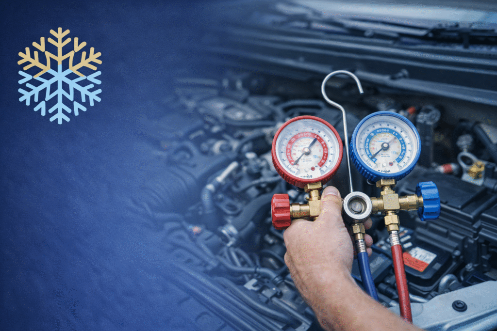 Mantenimiento y reparación del sistema de aire acondicionado automotriz. Incluye recarga de gas, detección y reparación de fugas, revisión del compresor y limpieza del sistema para asegurar un enfriamiento eficiente y cómodo.